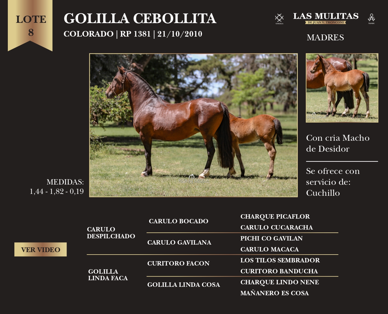 LOTE 8, Golilla Cebollita 🔥 🔥 🔥 Lote Anterior Volver al remate Lote Siguiente Ficha Contacto Ofertar Buenos Aires - Ficha del Lote Identificador: #349738 Categoría: Yeguas Altura: 1,44 Torax: 1,82 Caña: 0,19 Pedigree Descripción: Preñez: Se ofrece con servicio de: Cuchillo Cría: Macho del Desidor Buenos Aires - Ofertar Fecha de cierre: 26 de Noviembre a las 15:00hs. Aún no tiene ofertas Plazo: Contado 30 días 45 días 60 días 90 días 120 días 180 días Contado, 30 y 60 dias Su Oferta en $: − + Step: -20.000,00 / +20.000,00 Programar puja hasta: Programar puja hasta Aumentar puja programada 540000 900000 **Oferta al bulto Iniciar sesión para ofertar Ofertar Compra por $ 99.000.000,00 Ofertas Recibidas $ Fecha/Hora Estado Este lote aún no tiene preofertas. ¿Estás seguro de comprar el LOTE Golilla Cebollita por $ 99000000 ? 473 Visualizaciones ClicData Contacto Empresa: El Rincón Criollos Nombre*: Teléfono* : E-mail* : Mensaje Enviar Registrese gratis Este contenido Exclusivo está disponible sólo para usuarios registrados Ingresar