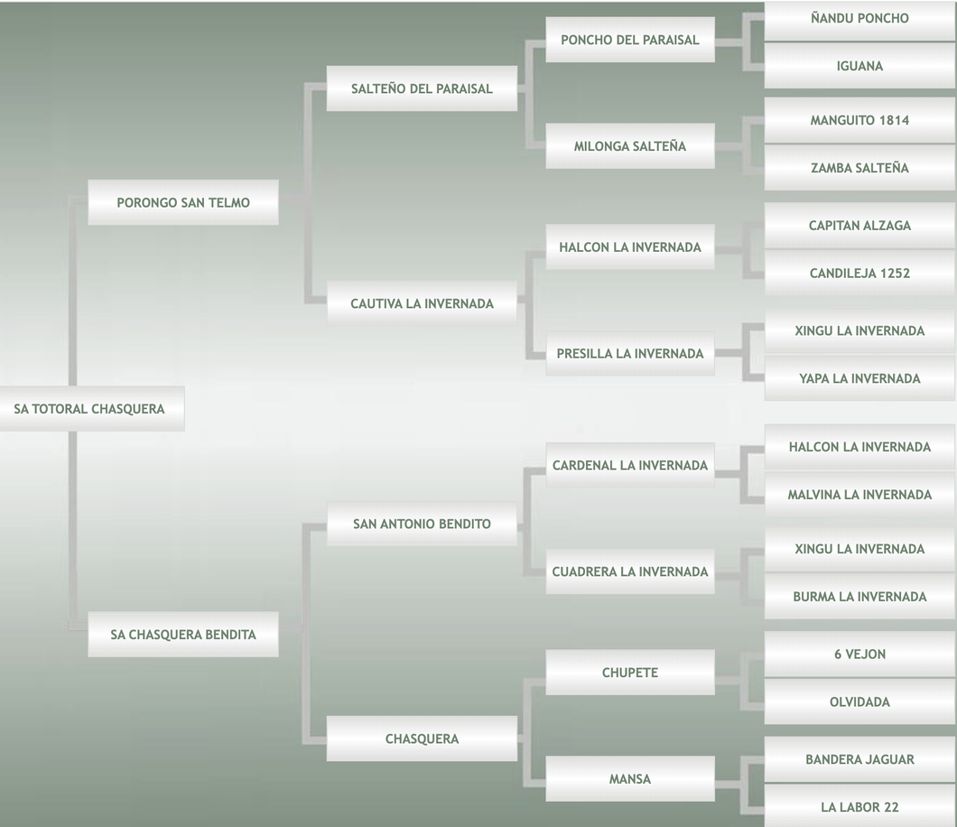 Potra que se destaca por su pedigree, la genética marchera esta en su sangre, tiene ganadoras de marchas como Cautiva La Invernada, Milonga Salteña, Cuadrera La Invernada, Mansa y finalistas de marchas como Chasquera, Poncho Del Paraisal 290.