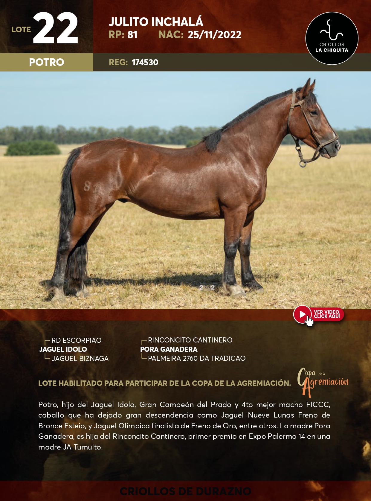 LOTE 22, JULITO INCHALÁ Lote Anterior Volver al remate Lote Siguiente Ficha Contacto Ofertar Durazno - Ficha del Lote Identificador: #357740 Categoría: Potro RP: 81 Pedigree Plazo 18 cuotas Durazno - Ofertar Fecha de cierre: 28 de Febrero a las 19:00hs. Aún no tiene ofertas Plazo: Contado 30 días 45 días 60 días 90 días 120 días 180 días Contado, 30 y 60 dias Su Oferta en U$S: (por 18 cuotas) − + Step: -5,00 / +5,00 Programar puja hasta: Programar puja hasta Aumentar puja programada 60 150 Iniciar sesión para ofertar Ofertar Compra por U$S 99.000.000,00 Ofertas Recibidas U$S Fecha/Hora Estado Este lote aún no tiene preofertas. ¿Estás seguro de comprar el LOTE JULITO INCHALÁ por 18 cuotas de U$S 99000000 ? 4 Visualizaciones ClicData Contacto Empresa: Juan Vera SRL Negocios Rurales Nombre*: Teléfono* : E-mail* : Mensaje Enviar