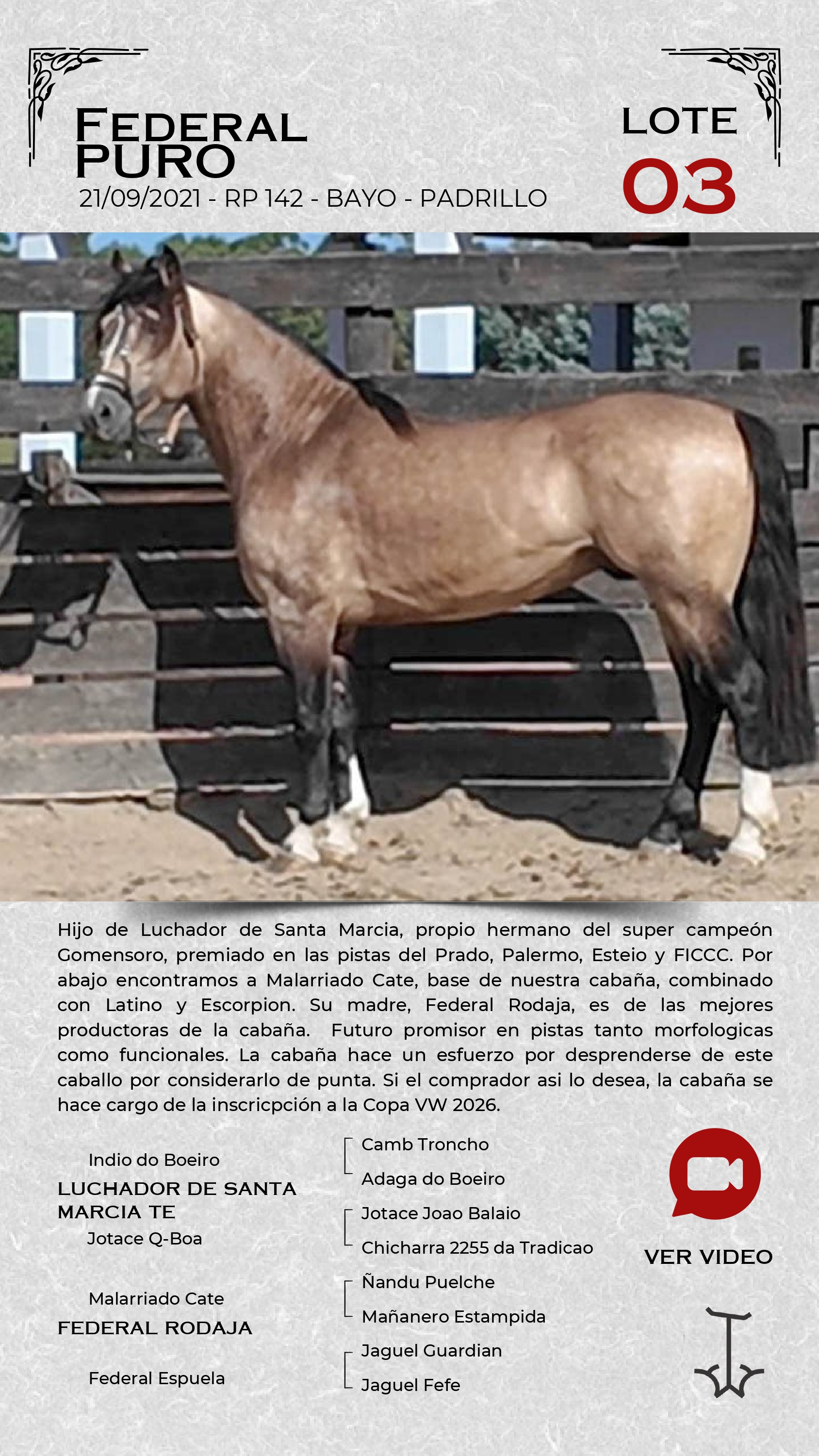 LOTE 3, FEDERAL PURO 🔥 🔥 🔥 Lote Anterior Volver al remate Lote Siguiente Ficha Contacto Ofertar Maldonado - Ficha del Lote Identificador: #360399 Categoría: Padrillo RP: 142 Pedigree Plazo 18 cuotas Maldonado - Ofertar Fecha de cierre: 13 de Marzo a las 18:00hs. Aún no tiene ofertas Plazo: Contado 30 días 45 días 60 días 90 días 120 días 180 días Contado, 30 y 60 dias Su Oferta en U$S: (por 18 cuotas) − + Step: -10,00 / +10,00 Programar puja hasta: Programar puja hasta Aumentar puja programada 290 470 Iniciar sesión para ofertar Ofertar Compra por U$S 99.000.000,00 Ofertas Recibidas U$S Fecha/Hora Estado Este lote aún no tiene preofertas. ¿Estás seguro de comprar el LOTE FEDERAL PURO por 18 cuotas de U$S 99000000 ? 173 Visualizaciones ClicData Contacto Empresa: JUAN FRANCISCO CHIRUCHI Nombre*: Teléfono* : E-mail* : Mensaje Por informes y consultas 099977007 Enviar