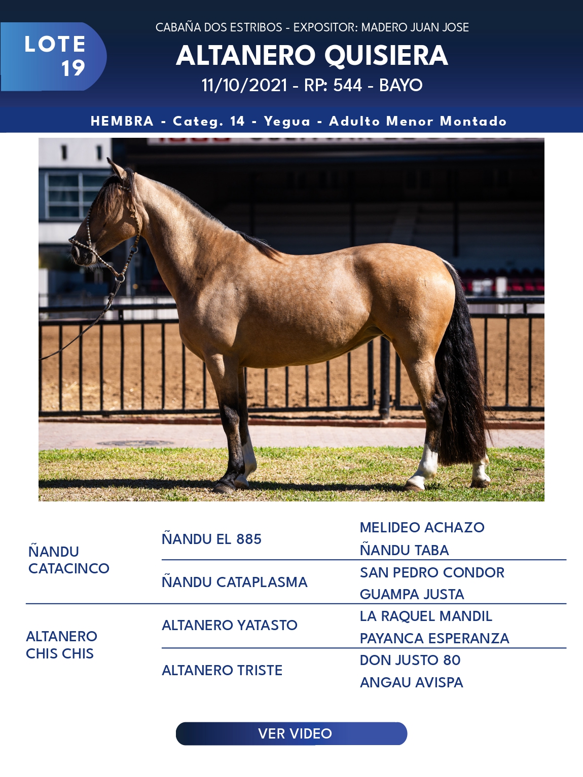 LOTE 19, ALTANERO QUISIERA Lote Anterior Volver al remate Lote Siguiente Ficha Contacto Ofertar Buenos Aires - Ficha del Lote Identificador: #363833 Categoría: Yeguas RP: 544 Pedigree Plazo 18 cuotas Buenos Aires - Ofertar Fecha de cierre: 29 de Marzo a las 15:00hs. Prórroga: 60 segundos Aún no tiene ofertas Plazo: Contado 30 días 45 días 60 días 90 días 120 días 180 días Contado, 30 y 60 dias Su Oferta en $: (por 18 cuotas) − + Step: -50.000,00 / +50.000,00 Programar puja hasta: Programar puja hasta Aumentar puja programada 550000 1450000 Iniciar sesión para ofertar Ofertar Compra por $ 99.000.000,00 Ofertas Recibidas $ Fecha/Hora Estado Este lote aún no tiene preofertas. ¿Estás seguro de comprar el LOTE ALTANERO QUISIERA por 18 cuotas de $ 99000000 ? 248 Visualizaciones ClicData Contacto Empresa: El Rincón Criollos Nombre*: Teléfono* : E-mail* : Mensaje Enviar Registrese gratis Este contenido Exclusivo está disponible sólo para usuarios registrados Ingresar
