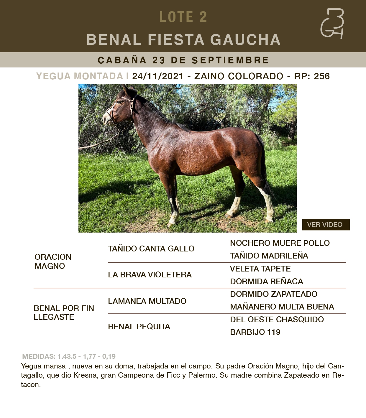LOTE 2, Benal Fiesta Gaucha 🔥 🔥 🔥 Lote Anterior Volver al remate Lote Siguiente Ficha Contacto Ofertar Buenos Aires - Ficha del Lote Identificador: #365775 Categoría: Yeguas Montadas RP: 256 Pedigree Plazo 15 cuotas Buenos Aires - Ofertar Fecha de cierre: 14 de Abril a las 15:00hs. Aún no tiene ofertas Plazo: Contado 30 días 45 días 60 días 90 días 120 días 180 días Contado, 30 y 60 dias Su Oferta en $: (por 15 cuotas) − + Step: -20.000,00 / +20.000,00 Programar puja hasta: Programar puja hasta Aumentar puja programada 490000 850000 Iniciar sesión para ofertar Ofertar Compra por $ 99.000.000,00 Ofertas Recibidas $ Fecha/Hora Estado Este lote aún no tiene preofertas. ¿Estás seguro de comprar el LOTE Benal Fiesta Gaucha por 15 cuotas de $ 99000000 ? 215 Visualizaciones ClicData Contacto Empresa: El Rincón Criollos Nombre*: Teléfono* : E-mail* : Mensaje Enviar Registrese gratis Este contenido Exclusivo está disponible sólo para usuarios registrados Ingresar