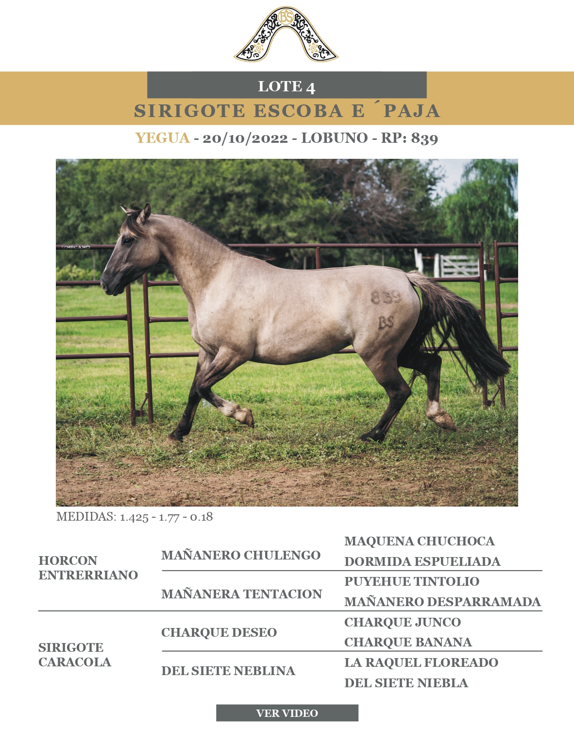 LOTE 4, SIRIGOTE ESCOBA E PAJA 🔥 🔥 🔥 Lote Anterior Volver al remate Lote Siguiente Ficha Contacto Ofertar Buenos Aires - Ficha del Lote Identificador: #365969 Categoría: Yeguas RP: 839 Pedigree Buenos Aires - Ofertar Fecha de cierre: 18 de Abril a las 12:00hs. Aún no tiene ofertas Plazo: Contado 30 días 45 días 60 días 90 días 120 días 180 días Contado, 30 y 60 dias Su Oferta en $: − + Step: -50.000,00 / +50.000,00 Programar puja hasta: Programar puja hasta Aumentar puja programada 650000 1550000 **Oferta al bulto Iniciar sesión para ofertar Ofertar Compra por $ 99.000.000,00 Ofertas Recibidas $ Fecha/Hora Estado Este lote aún no tiene preofertas. ¿Estás seguro de comprar el LOTE SIRIGOTE ESCOBA E PAJA por $ 99000000 ? 182 Visualizaciones ClicData Contacto Empresa: El Rincón Criollos Nombre*: Teléfono* : E-mail* : Mensaje Enviar Registrese gratis Este contenido Exclusivo está disponible sólo para usuarios registrados Ingresar
