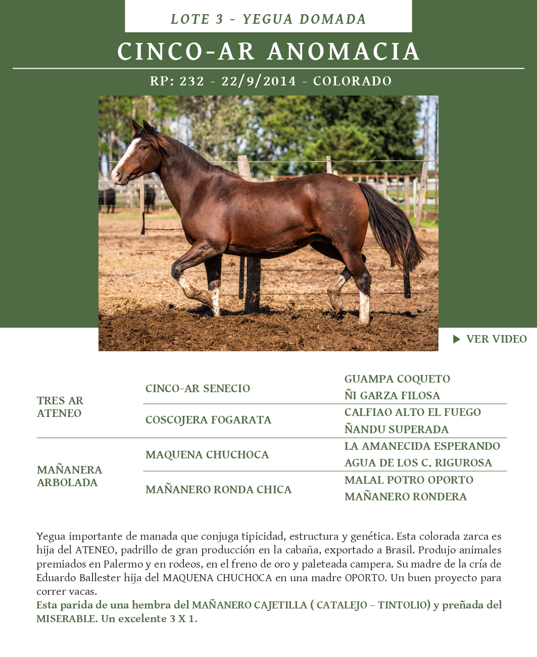 LOTE 3, CINCO-AR ANOMACIA 🔥 🔥 🔥 Lote Anterior Volver al remate Lote Siguiente Ficha Contacto Buenos Aires - Ficha del Lote Identificador: #367455 Categoría: Yegua Domada RP: 232 Pedigree Buenos Aires - 116 Visualizaciones ClicData Contacto Empresa: El Rincón Criollos Nombre*: Teléfono* : E-mail* : Mensaje Enviar Registrese gratis Este contenido Exclusivo está disponible sólo para usuarios registrados Ingresar