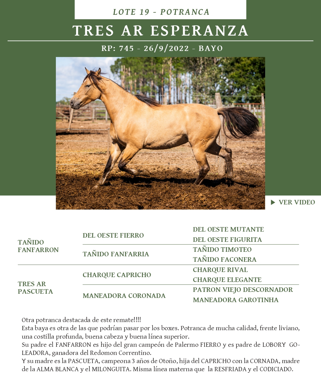 LOTE 19, TRES AR ESPERANZA Lote Anterior Volver al remate Lote Siguiente Ficha Contacto Ofertar Buenos Aires - Ficha del Lote Identificador: #367471 Categoría: Potrancas Altura: 1,45 Torax: 1,86 Caña: 0,19 RP: 745 Pedigree Buenos Aires - Ofertar Fecha de cierre: 23 de Abril a las 15:00hs. Aún no tiene ofertas Plazo: Contado 30 días 45 días 60 días 90 días 120 días 180 días Contado, 30 y 60 dias Su Oferta en $: − + Step: -50.000,00 / +50.000,00 Programar puja hasta: Programar puja hasta Aumentar puja programada 600000 1500000 **Oferta al bulto Iniciar sesión para ofertar Ofertar Compra por $ 99.000.000,00 Ofertas Recibidas $ Fecha/Hora Estado Este lote aún no tiene preofertas. ¿Estás seguro de comprar el LOTE TRES AR ESPERANZA por $ 99000000 ? 68 Visualizaciones ClicData Contacto Empresa: El Rincón Criollos Nombre*: Teléfono* : E-mail* : Mensaje Enviar Registrese gratis Este contenido Exclusivo está disponible sólo para usuarios registrados Ingresar