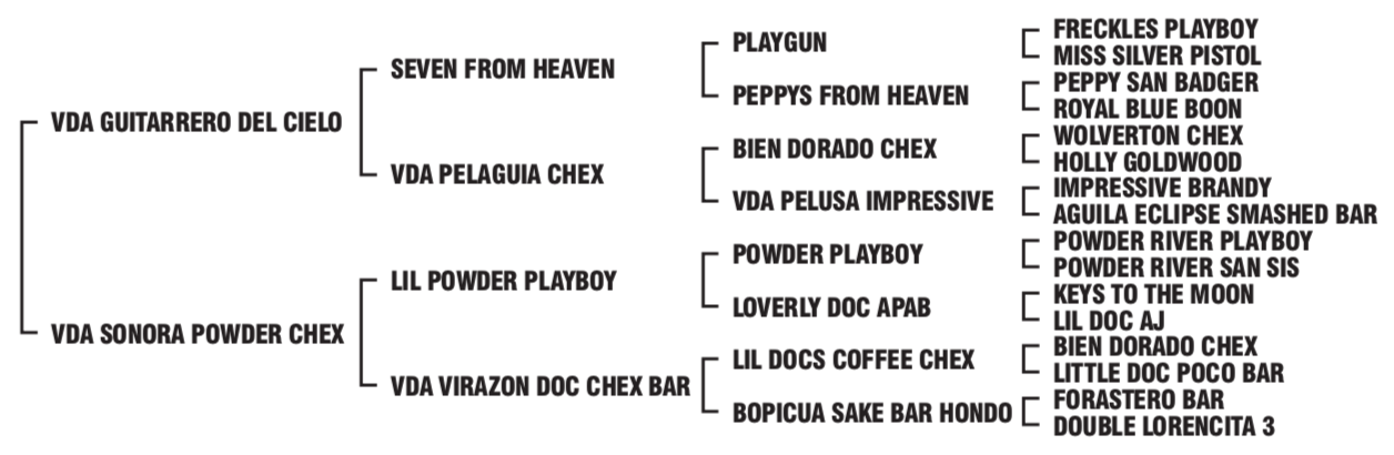 Su padre es hijo de Seven from Heaven padrillo campeón de aparte de ganado (cutting) en USA y de gran producción en Uruguay y nieto de Bien Dorado Chex padrillo destacado de rienda importado de USA.