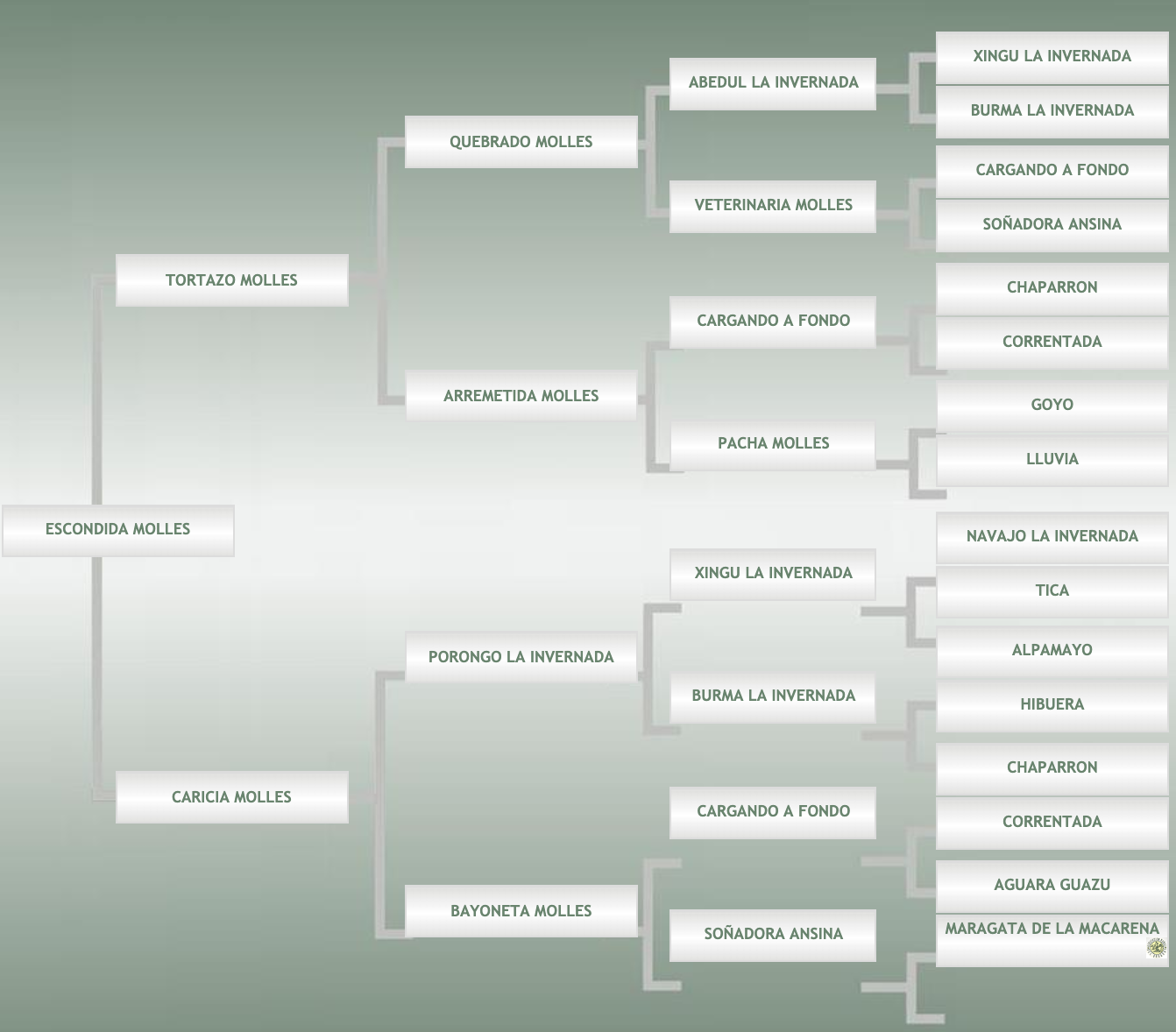 CARICIA MOLLES, esta yegua conjuga excelentes sangres, su padre, Porongo La Invernada es hermano entero de Abedul La Invernada (ver referencias) y su madre Bayoneta Molles es hermana entera de Veterinaria Molles y Ojo al Cristo Molles (ver referencias)