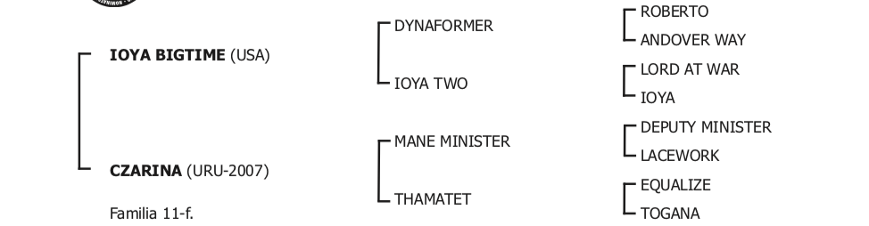 IOYA BIGTIME (USA-2007), por Dynaformer: “Caballo del Año en Illinois en 2012” Ganador de 6 carreras en USA., u$s 540.149.-, Kentucky Cup Turf Stakes (G3), Stars And Stripes Stakes (G3), 2do. Fayette Stakes (G2), Pan American Stakes (G2), Sycamore Stakes (G3), American St. Leger Stakes (USA-L), 3ro. Mac Diarmida Stakes (G2), etc. Es padre de: NEGRONE (URU.- Clás. Criadores Nacionales (URU- 3), Clás. Carlos Reyles (URU-L), 2do. Gran Premio Nacional (URU-1), etc.), Ioya Uno (2do. Clás. Argentina (L).), Iole (2da. Clás. Producción Nacional (URU), 4ta. GP Polla de Potrancas (URU-1), etc), LAIXA MOON (4ta.- Gran Premio Selección (URU), etc.), START TIME (4to. Clás. Adolfo Folle Juanico (URU), etc.), AMEN (Clás. Amodeo (URU), Clás. Guzmán Vargas (URU), etc.), etc.