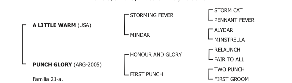 Punch Glory (ARG), por Honour And Glory.- Ganadora de 2 carreras en Palermo y San Isidro a los 2 y 3 años, 2da. Clás. Carlos Tomkinson (G2), 3ra. Clás. República Oriental del Uruguay (G3). Madre de: