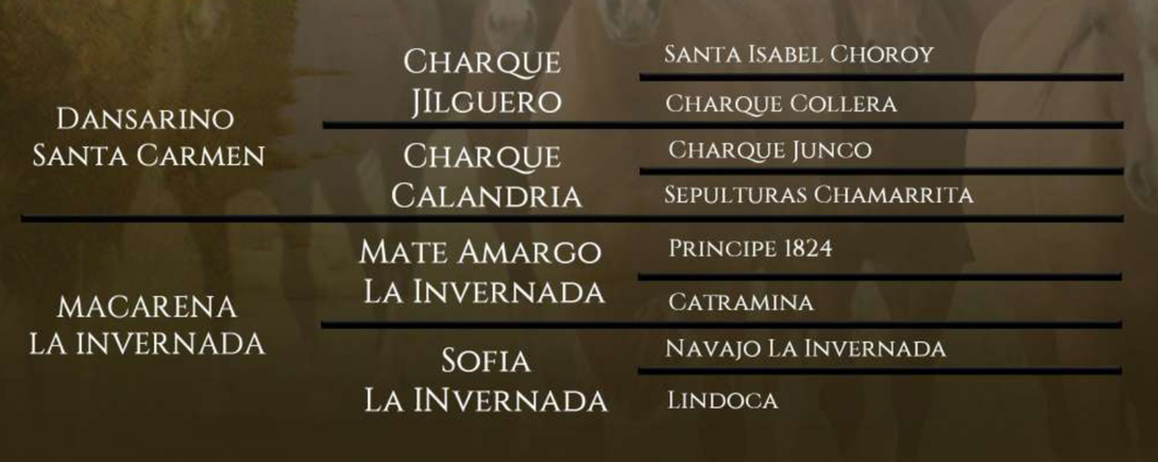Por madre es hermana de Santa Gloria Macabra, ganadora de marcha y por padre es hermana de un montón de buenos pingos de rienda y trabajo de campo.