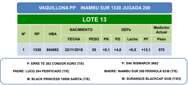 LOTE 26, VAQUILLONA PP ANGUS "INAMBÚ" 🔥 🔥 🔥 Lote Anterior Volver al remate Lote Siguiente Información del Lote Pedigree Ofertar Contacto Buenos Aires - Balcarce Información del Lote Identificador: #79091 Categoría Vaquillonas PP preñadas Raza Angus Negro y Colorado Certificado 13 Departamento Buenos Aires Ubicación Balcarce Plazo Consultar Buenos Aires - Balcarce Ofertar Aún no tiene ofertas Plazo: Contado 30 días 45 días 60 días 90 días 120 días 180 días Contado, 30 y 60 dias Su Oferta en $: − + Step: -10.000,00 / +10.000,00 Programar puja hasta: Programar puja hasta Aumentar puja programada 170000 350000 **Oferta al bulto Iniciar sesión para ofertar Ofertar Listado de preofertas $ Fecha/Hora Estado Este lote aún no tiene preofertas. 189 Visualizaciones ClicData Pedigree Contacto Comercial a cargo: Stefanía Empresa: FONTANA CONSIGNATARIOS S.A. Nombre*: E-mail* : Mensaje Enviar Registrese gratis Este contenido Exclusivo está disponible sólo para usuarios registrados Ingresar