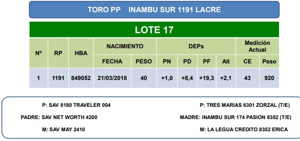 LOTE 30, TORO PP ANGUS "INAMBÚ" 🔥 🔥 🔥 Lote Anterior Volver al remate Lote Siguiente Información del Lote Pedigree Ofertar Contacto Buenos Aires - Balcarce Información del Lote Identificador: #80244 Categoría Toros PP Raza Angus Negro Certificado 17 Departamento Buenos Aires Ubicación Balcarce Plazo Consultar Buenos Aires - Balcarce Ofertar Aún no tiene ofertas Plazo: Contado 30 días 45 días 60 días 90 días 120 días 180 días Contado, 30 y 60 dias Su Oferta en $: − + Step: -1.000,00 / +1.000,00 Programar puja hasta: Programar puja hasta Aumentar puja programada 182000 200000 **Oferta al bulto Iniciar sesión para ofertar Ofertar Listado de preofertas $ Fecha/Hora Estado Este lote aún no tiene preofertas. 156 Visualizaciones ClicData Pedigree Contacto Comercial a cargo: Stefanía Empresa: FONTANA CONSIGNATARIOS S.A. Nombre*: E-mail* : Mensaje Enviar Registrese gratis Este contenido Exclusivo está disponible sólo para usuarios registrados Ingresar
