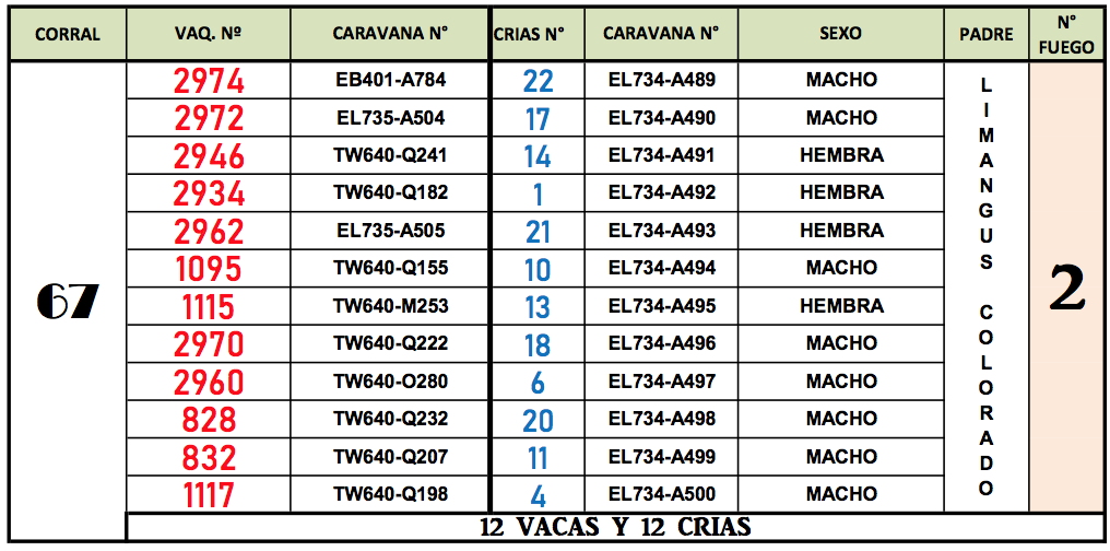 | Observaciones | TORO PADRE LIMANGUS COLORADO |