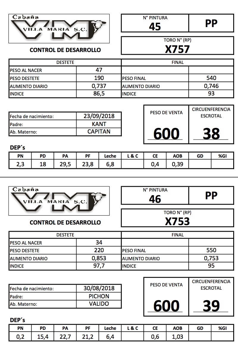 LOTE 23, Toros P. Hereford PP de 2 años. Lote Anterior Volver al remate Lote Siguiente Información del Lote Animales del Lote Pedigree Contacto La Pampa - Eduardo Castex Información del Lote Identificador: #83999 Cantidad 2 Categoría Toros PP Raza Polled Hereford Departamento La Pampa Ubicación Eduardo Castex Plazo 30, 60, 90, 120 y 150 días La Pampa - Eduardo Castex 124 Visualizaciones ClicData Animales del Lote RP 45 46 CE 38 39 PF 600 600 PN 47 34 PRECIO BASE 0.00 0.00 RP 45 CE 38 PF 600 PN 47 PRECIO BASE 0.00 RP 46 CE 39 PF 600 PN 34 PRECIO BASE 0.00 Pedigree Contacto Comercial a cargo: Mauricio Gabriel Empresa: BRANDEMANN CONSIGNATARIA S.R.L. Nombre*: E-mail* : Mensaje Por informes y consultas 02334-444113 Enviar Registrese gratis Este contenido Exclusivo está disponible sólo para usuarios registrados Ingresar