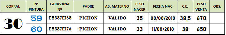 LOTE 30, Toros P. Hereford PR de 2 años. Lote Anterior Volver al remate Lote Siguiente Información del Lote Animales del Lote Pedigree Contacto La Pampa - Eduardo Castex Información del Lote Identificador: #84045 Cantidad 2 Categoría Toros PR Raza Polled Hereford Departamento La Pampa Ubicación Eduardo Castex Plazo 30, 60, 90, 120 y 150 días La Pampa - Eduardo Castex 87 Visualizaciones ClicData Animales del Lote RP 59 60 CE 38,5 38 PF 670 650 PN 35 33 PRECIO BASE 0.00 0.00 RP 59 CE 38,5 PF 670 PN 35 PRECIO BASE 0.00 RP 60 CE 38 PF 650 PN 33 PRECIO BASE 0.00 Pedigree Contacto Comercial a cargo: Mauricio Gabriel Empresa: BRANDEMANN CONSIGNATARIA S.R.L. Nombre*: E-mail* : Mensaje Por informes y consultas 02334-444113 Enviar Registrese gratis Este contenido Exclusivo está disponible sólo para usuarios registrados Ingresar