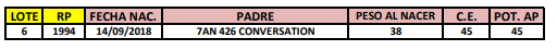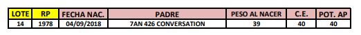 Info Genética (1950) PADRE MAC´ACHIN CAPO NACIMIENTO 14/8/2018 PRECIO BASE 0.00 IMAGEN 0osaLq0wiTclZIUR.png Info Genética (1978) PADRE 7AN 426 CONVERSATION NACIMIENTO 4/9/2018 PRECIO BASE 0.00 IMAGEN I4tJ51IYAp22pBxh.png -
