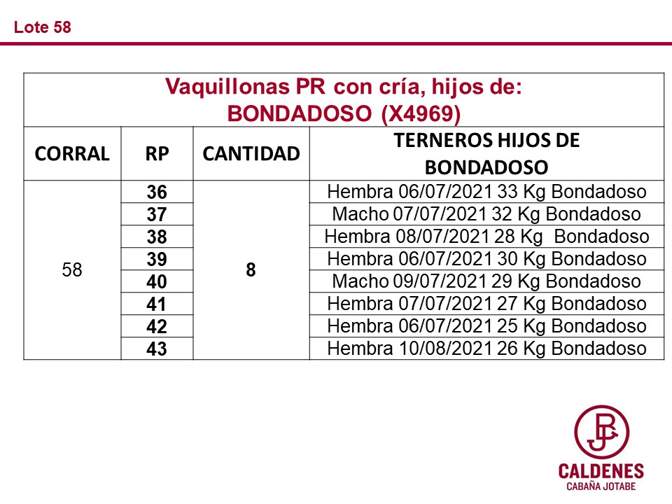 LOTE 52, Vaquillonas PR con cría, hijos de BONDADOSO(Corral 58) 🔥 🔥 🔥 Lote Anterior Volver al remate Lote Siguiente Información del Lote Pedigree Ofertar Contacto Buenos Aires - Información del Lote Identificador: #125557 Cantidad 8 Categoría Hembras Registrados Raza Hereford Departamento Buenos Aires Plazo Consultar Buenos Aires - Ofertar Fecha de cierre: 02 de Septiembre a las 12:05hs. Prórroga: 5 minutos Aún no tiene ofertas Plazo: Contado 30 días 45 días 60 días 90 días 120 días 180 días Contado, 30 y 60 dias Su Oferta en $: − + Step: -10.000,00 / +10.000,00 Programar puja hasta: Programar puja hasta Aumentar puja programada 200000 380000 **Oferta al bulto Iniciar sesión para ofertar Ofertar Compra por $ 99.000.000,00 Ofertas Recibidas $ Fecha/Hora Estado Este lote aún no tiene preofertas. ¿Estás seguro de comprar el LOTE Vaquillonas PR con cría, hijos de BONDADOSO(Corral 58) por $ 99000000 ? 90 Visualizaciones ClicData Pedigree Contacto Comercial a cargo: Paulo Empresa: Caldenes Agropecuaria Nombre*: E-mail* : Mensaje Por informes y consultas 03382 15 418112 Enviar Registrese gratis Este contenido Exclusivo está disponible sólo para usuarios registrados Ingresar