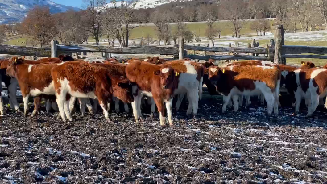 muy buena crianza sector valle Simpson, destetadas hace 15 días , se pesan en la feria 1,5. % destara , una hora de traslado a la feria, flete 140-170 , el peso es aproximado , 64 clávelas 1 angus roja