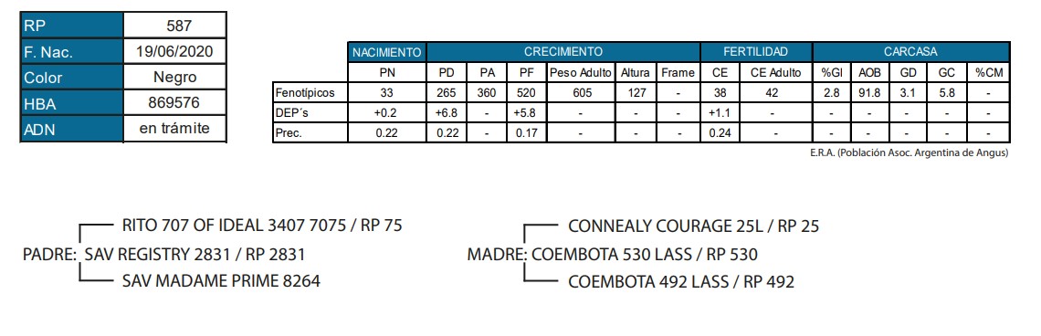 | Observaciones | Su madre es una destacada vaquillona del plantel puro de pedigree de Coembotá. Reproductor con muy buenos índices carniceros, con excelente área de ojo de bife, moderado de grasa y buena grasa intramuscular. Ideal para mejorar rodeos comerciales en el rinde carnicero. Muy buen peso al destete y Circunferencia escrotal. |