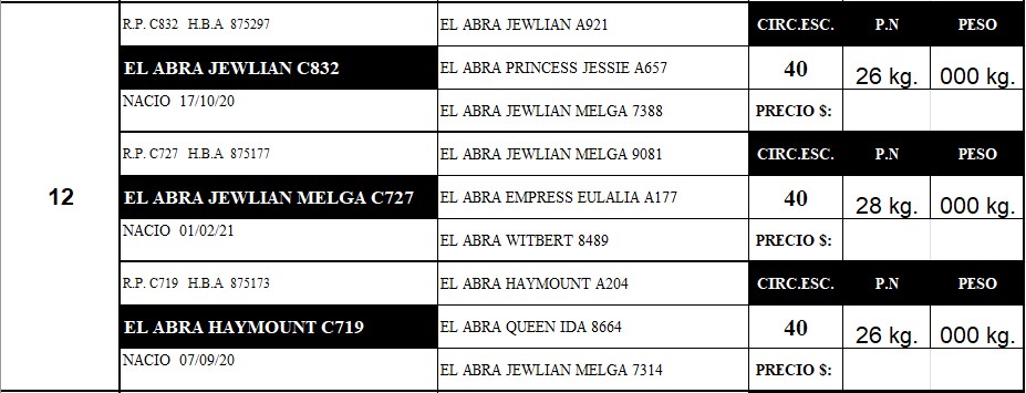 LOTE 12, TOROS PUROS DE PEDIGREE Lote Anterior Volver al remate Lote Siguiente Información del Lote Animales del Lote Pedigree Ofertar Contacto Buenos Aires - Daireaux - Buenos Aires Información del Lote Identificador: #172773 Cantidad 3 Categoría Toros PP Departamento Buenos Aires Ubicación Daireaux - Buenos Aires Buenos Aires - Daireaux - Buenos Aires Ofertar **LA PRE OFERTA ES POR UN ANIMAL Fecha de cierre: 07 de Septiembre a las 20:00hs. Aún no tiene ofertas Animales: (1)-C832 (2)-C727 (3)-C719 Plazo: Contado 30 días 45 días 60 días 90 días 120 días 180 días Contado, 30 y 60 dias Su Oferta en $: − + Step: -0,01 / +0,01 Programar puja hasta: Programar puja hasta Aumentar puja programada 800000.02 800000.2 ** Iniciar sesión para ofertar Ofertar Ofertas Recibidas $ Fecha/Hora Estado Este lote aún no tiene preofertas. 124 Visualizaciones ClicData Animales del Lote RP (1)-C832 (2)-C727 (3)-C719 PRECIO BASE 0.00 0.00 0.00 RP (1)-C832 PRECIO BASE 0.00 RP (2)-C727 PRECIO BASE 0.00 RP (3)-C719 PRECIO BASE 0.00 Pedigree Contacto Empresa: MONASTERIO TATTERSALL S.A. Nombre*: E-mail* : Mensaje Enviar Registrese gratis Este contenido Exclusivo está disponible sólo para usuarios registrados Ingresar