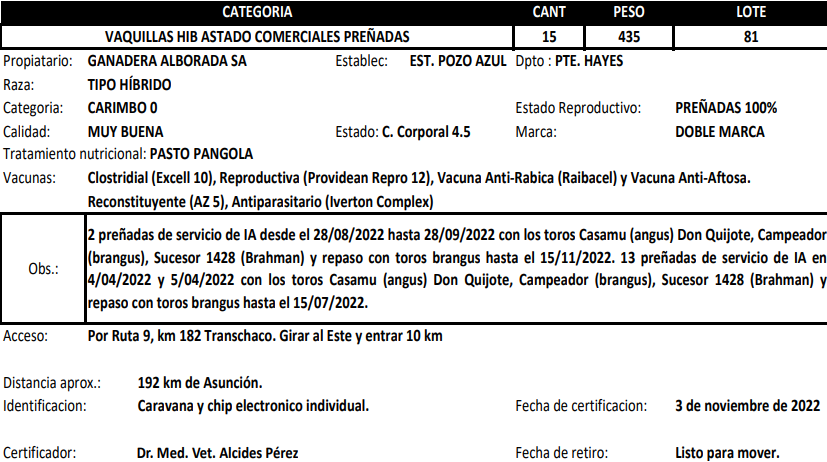 Lote doble marca. 2 preñadas de servicio de IA desde el 28/08/2022 hasta 28/09/2022 con los toros Casamu (Angus) Don Quijote, Campeador (Brangus), Sucesor 1428 (Brahman) y repaso con toros Brangus hasta el 15/11/2022. 13 preñadas de servicio de IA en 4/04/2022 y 5/04/2022 con los toros Casamu (Angus) Don Quijote, Campeador (Brangus), Sucesor 1428 (Brahman) y repaso con toros Brangus hasta el 15/07/2022.