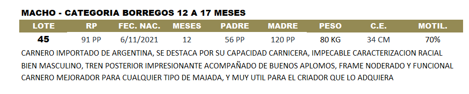 Carnero PP, nacido el 06/11/21, peso 80 Kg, circunferencia escrotal 34 cm,