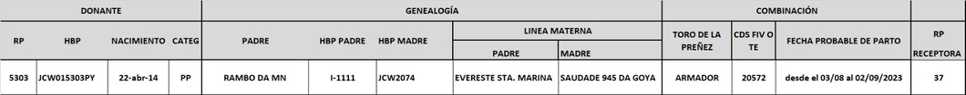 La RP 5303 no solo se alzó con dos GRANDES CAMPEONATOS NACIONALES. También se destacó y sigue destacándose como donante Elite de nuestra cabaña. La misma es hija directa de la GRAN FABULA DA GOYA, única hembra de la raza en alcanzar un TRI GRAN CAMPEONATO en Uberaba - Brasil. Sus mayores destaques productivos son: En la raza Nelore Mocho, la RP 7539 BI GRAN CAMPEONA de la EXPO NACIONAL NELORE 2022 Y 2023 y en la Raza Nelore Padrán la RP 7425 GRAN CAMPEONA NACIONAL 2022 Y GRAN CAMPEONA en la EXPO INTERNACIONAL 2022. Todos estos logros la llevaron a ella a ser calificada como "VIENTRE DE ORO" y hoy día la firma GOYA S.A., pone a disposición de sus clientes un Embrión de esta GRAN DONANTE con otro gigante de la Raza Nelore "REM ARMADOR", que en la actualidad lidera el Ranking de los MEJORES REPRODUCTORES.