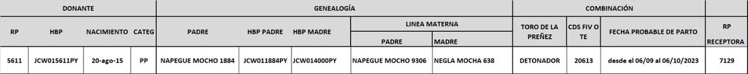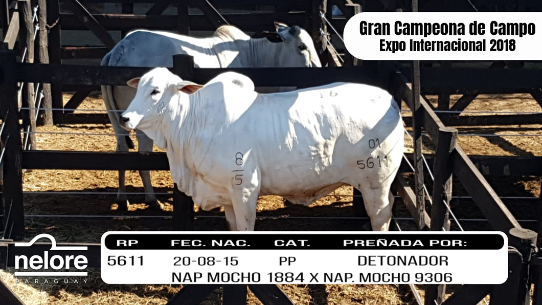 La donante 5611 fue Gran Campeona de Campo en la Expo Internacional 2018, fue adquirida por un condominio, de la que forma parte Cabaña Unión S.A. El padre de esta donante es el famoso Napegue Mocho 1884, el toro TRI GRAN CAMPEON de Goya S.A., uno de los más famosos en produción y ahora ella está preñada por uno de los toros más utilizados en la raza Nelore Mocho: DETONADOR DE CAMPARINO.