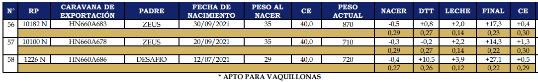 LOTE 21, TOROS ANGUS PUROS CONTROLADOS Lote Anterior Volver al remate Lote Siguiente Información del Lote Animales del Lote Pedigree Ofertar Contacto Buenos Aires - 9 de Julio. - Buenos Aires. Información del Lote Identificador: #232564 Cantidad 3 Categoría Toros Departamento Buenos Aires Ubicación 9 de Julio. - Buenos Aires. Buenos Aires - 9 de Julio. - Buenos Aires. Ofertar Fecha de cierre: 30 de Agosto a las 20:00hs. Aún no tiene ofertas Animales: (56) 10182 N (57) 10100 N (58) 1226 N Plazo: Contado 30 días 45 días 60 días 90 días 120 días 180 días Contado, 30 y 60 dias Su Oferta en $: − + Step: -50.000,00 / +50.000,00 Programar puja hasta: Programar puja hasta Aumentar puja programada 750000 1650000 **Oferta al bulto Iniciar sesión para ofertar Ofertar Compra por $ 99.000.000,00 Ofertas Recibidas $ Fecha/Hora Estado Este lote aún no tiene preofertas. ¿Estás seguro de comprar el LOTE TOROS ANGUS PUROS CONTROLADOS por $ 99000000 ? 36 Visualizaciones ClicData Animales del Lote RP (56) 10182 N (57) 10100 N (58) 1226 N PADRE ZEUS ZEUS DESAFIO NAC 30/9/2021 20/9/2021 12/7/2021 CE 40 40 40 PF 870 710 720 PN 35 35 29 PRECIO BASE 0.00 0.00 0.00 RP (56) 10182 N PADRE ZEUS NAC 30/9/2021 CE 40 PF 870 PN 35 PRECIO BASE 0.00 RP (57) 10100 N PADRE ZEUS NAC 20/9/2021 CE 40 PF 710 PN 35 PRECIO BASE 0.00 RP (58) 1226 N PADRE DESAFIO NAC 12/7/2021 CE 40 PF 720 PN 29 PRECIO BASE 0.00 Pedigree Contacto Empresa: La Cassina Nombre*: E-mail* : Mensaje Enviar Registrese gratis Este contenido Exclusivo está disponible sólo para usuarios registrados Ingresar