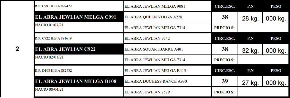 LOTE 2, TOROS PUROS DE PEDIGREE 🔥 🔥 🔥 Lote Anterior Volver al remate Lote Siguiente Información del Lote Animales del Lote Pedigree Ofertar Contacto Buenos Aires - Daireaux Información del Lote Identificador: #233530 Cantidad 3 Categoría Toros Departamento Buenos Aires Ubicación Daireaux Buenos Aires - Daireaux Ofertar Fecha de cierre: 06 de Septiembre a las 20:00hs. Aún no tiene ofertas Animales: (1)-C991 (2)-C922 (3)-D108 Plazo: Contado 30 días 45 días 60 días 90 días 120 días 180 días Contado, 30 y 60 dias Su Oferta en $: − + Step: -0,01 / +0,01 Programar puja hasta: Programar puja hasta Aumentar puja programada 1200000.02 1200000.2 ** Iniciar sesión para ofertar Ofertar Ofertas Recibidas $ Fecha/Hora Estado Este lote aún no tiene preofertas. 155 Visualizaciones ClicData Animales del Lote RP (1)-C991 (2)-C922 (3)-D108 PRECIO BASE 0.00 0.00 0.00 RP (1)-C991 PRECIO BASE 0.00 RP (2)-C922 PRECIO BASE 0.00 RP (3)-D108 PRECIO BASE 0.00 Pedigree Contacto Empresa: MONASTERIO TATTERSALL S.A. Nombre*: E-mail* : Mensaje Enviar Registrese gratis Este contenido Exclusivo está disponible sólo para usuarios registrados Ingresar