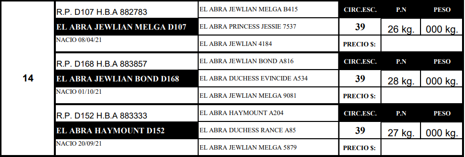 LOTE 14, TOROS PUROS DE PEDIGREE 🔥 🔥 🔥 Lote Anterior Volver al remate Lote Siguiente Información del Lote Animales del Lote Pedigree Ofertar Contacto Buenos Aires - Daireaux Información del Lote Identificador: #233542 Cantidad 3 Categoría Toros Departamento Buenos Aires Ubicación Daireaux Buenos Aires - Daireaux Ofertar Fecha de cierre: 06 de Septiembre a las 20:00hs. Aún no tiene ofertas Animales: (1)-D107 (2)-D168 (3)-D152 Plazo: Contado 30 días 45 días 60 días 90 días 120 días 180 días Contado, 30 y 60 dias Su Oferta en $: − + Step: -0,01 / +0,01 Programar puja hasta: Programar puja hasta Aumentar puja programada 1200000.02 1200000.2 ** Iniciar sesión para ofertar Ofertar Ofertas Recibidas $ Fecha/Hora Estado Este lote aún no tiene preofertas. 172 Visualizaciones ClicData Animales del Lote RP (1)-D107 (2)-D168 (3)-D152 PRECIO BASE 0.00 0.00 0.00 RP (1)-D107 PRECIO BASE 0.00 RP (2)-D168 PRECIO BASE 0.00 RP (3)-D152 PRECIO BASE 0.00 Pedigree Contacto Empresa: MONASTERIO TATTERSALL S.A. Nombre*: E-mail* : Mensaje Enviar Registrese gratis Este contenido Exclusivo está disponible sólo para usuarios registrados Ingresar