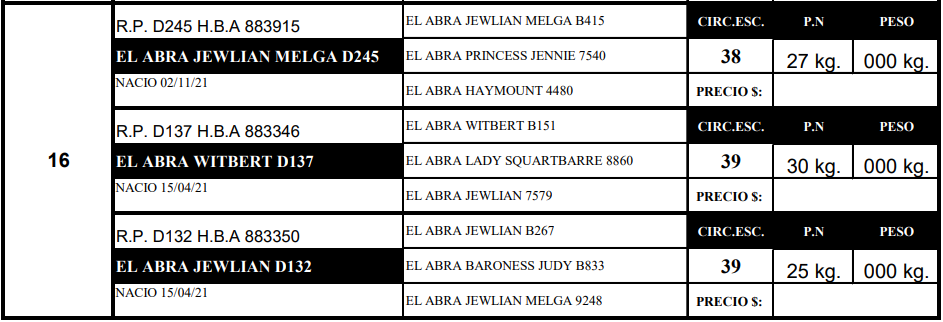 LOTE 16, TOROS PUROS DE PEDIGREE Lote Anterior Volver al remate Lote Siguiente Información del Lote Animales del Lote Pedigree Ofertar Contacto Buenos Aires - Daireaux Información del Lote Identificador: #233544 Cantidad 3 Categoría Toros Departamento Buenos Aires Ubicación Daireaux Buenos Aires - Daireaux Ofertar Fecha de cierre: 06 de Septiembre a las 20:00hs. Aún no tiene ofertas Animales: (1)-D245 (2)-D137 (3)-D132 Plazo: Contado 30 días 45 días 60 días 90 días 120 días 180 días Contado, 30 y 60 dias Su Oferta en $: − + Step: -0,01 / +0,01 Programar puja hasta: Programar puja hasta Aumentar puja programada 1200000.02 1200000.2 ** Iniciar sesión para ofertar Ofertar Ofertas Recibidas $ Fecha/Hora Estado Este lote aún no tiene preofertas. 50 Visualizaciones ClicData Animales del Lote RP (1)-D245 (2)-D137 (3)-D132 PRECIO BASE 0.00 0.00 0.00 RP (1)-D245 PRECIO BASE 0.00 RP (2)-D137 PRECIO BASE 0.00 RP (3)-D132 PRECIO BASE 0.00 Pedigree Contacto Empresa: MONASTERIO TATTERSALL S.A. Nombre*: E-mail* : Mensaje Enviar Registrese gratis Este contenido Exclusivo está disponible sólo para usuarios registrados Ingresar