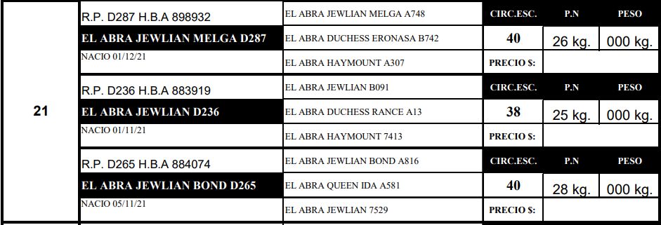 LOTE 21, TOROS PUROS DE PEDIGREE Lote Anterior Volver al remate Lote Siguiente Información del Lote Animales del Lote Pedigree Ofertar Contacto Buenos Aires - Daireaux Información del Lote Identificador: #233549 Cantidad 3 Categoría Toros Departamento Buenos Aires Ubicación Daireaux Buenos Aires - Daireaux Ofertar Fecha de cierre: 06 de Septiembre a las 20:00hs. Aún no tiene ofertas Animales: (1)-D287 (2)-D236 (3)-D265 Plazo: Contado 30 días 45 días 60 días 90 días 120 días 180 días Contado, 30 y 60 dias Su Oferta en $: − + Step: -0,01 / +0,01 Programar puja hasta: Programar puja hasta Aumentar puja programada 1200000.02 1200000.2 ** Iniciar sesión para ofertar Ofertar Ofertas Recibidas $ Fecha/Hora Estado Este lote aún no tiene preofertas. 44 Visualizaciones ClicData Animales del Lote RP (1)-D287 (2)-D236 (3)-D265 PRECIO BASE 0.00 0.00 0.00 RP (1)-D287 PRECIO BASE 0.00 RP (2)-D236 PRECIO BASE 0.00 RP (3)-D265 PRECIO BASE 0.00 Pedigree Contacto Empresa: MONASTERIO TATTERSALL S.A. Nombre*: E-mail* : Mensaje Enviar Registrese gratis Este contenido Exclusivo está disponible sólo para usuarios registrados Ingresar