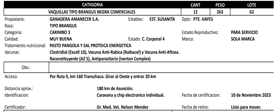 | Raza | TIPO BRANGUS NEGRO |