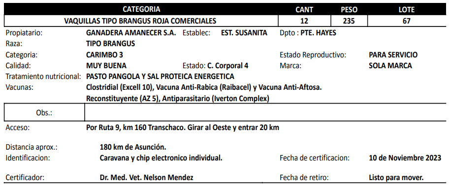 | Raza | TIPO BRANGUS ROJO |