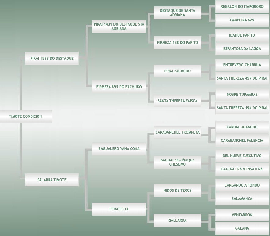 Hija del Pirai 1583 en una madre que combina al Bagualero, con una yegua origen de San Pedro, hija del Nido de Teros que va a Cargando y Reconquistada y por línea baja a Ventarrón, Guazubirá, Tia Macaria 4° y Gavilán, todos animales de renombre.