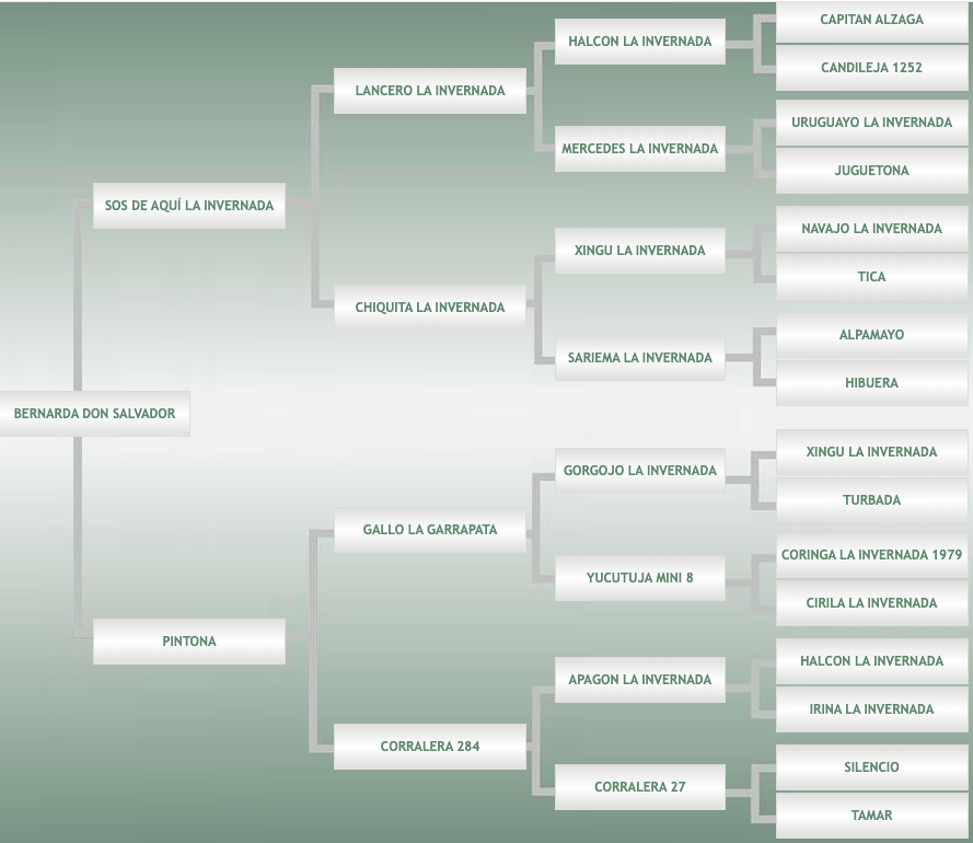 Hija de Sos de Aquí La Invernada y Pintona 46, es por padre hermana de Serena Don Salvador ganadora Marcha Florida 2022 categoría menores, hermana entera de Rp 91 (Picasa) ganadora de marchita Agremiacion de Caballos Criollos de Salto y de Marchita San Antonio 2019, hermana de Morocha Don Salvador ganadora marchita Agremiacion de Caballos Criollos de Salto 2021, la madre es hermana entera de Avispa 48 vendida a Cabaña la Chinita de Sorondo que es madre de Rp 6 ganadora de varias marchitas y enduros.