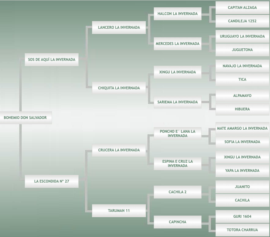 Hijo de Sos de Aquí La Invernada y la Escondida 27, por padre tiene varios hermanos ganadores y la madre de las mejores yeguas que tiene la cabaña.