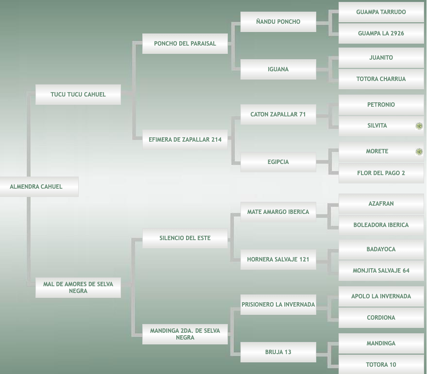 Tucu Tucu Cahuel es hijo de Poncho del Paraisal y madre Efímera del Zapallar. Yegua con un pedigree difícil de encontrar. Tiene fundadores de La Invernada como Petronio, Morete y Flor del Pago La Invernada