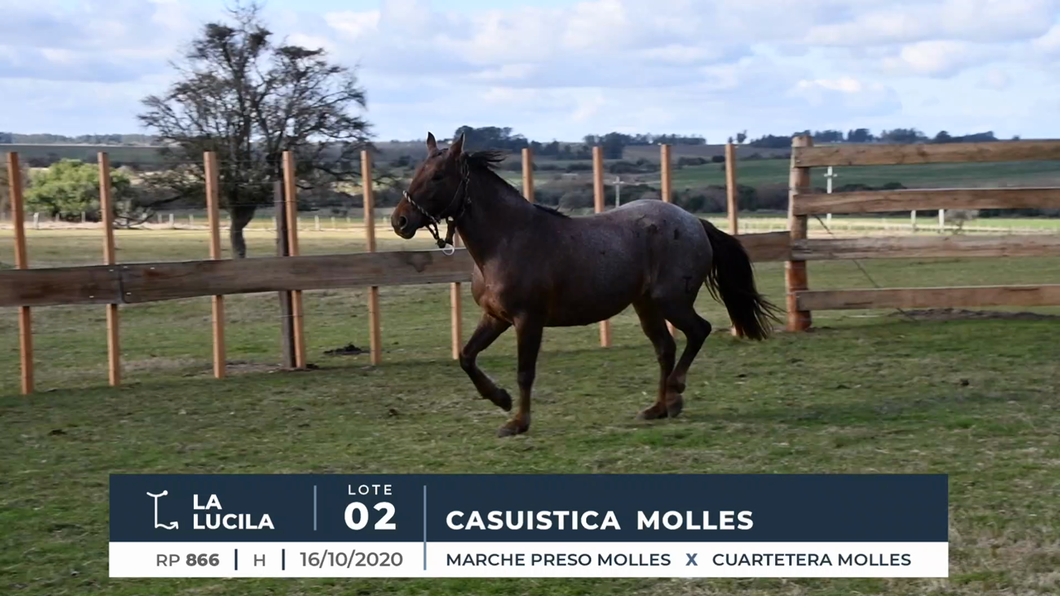 Su madre Cuartetera Molles por un corte en las dos patas no se pudo domar, la misma es muy linda yegua y de buenos movimientos. Hija de Parejera Molles ganadora de Marcha Melo 2001 y hermana de Pulga Molles 3er. puesto categoría menores Marcha Florida 2022.