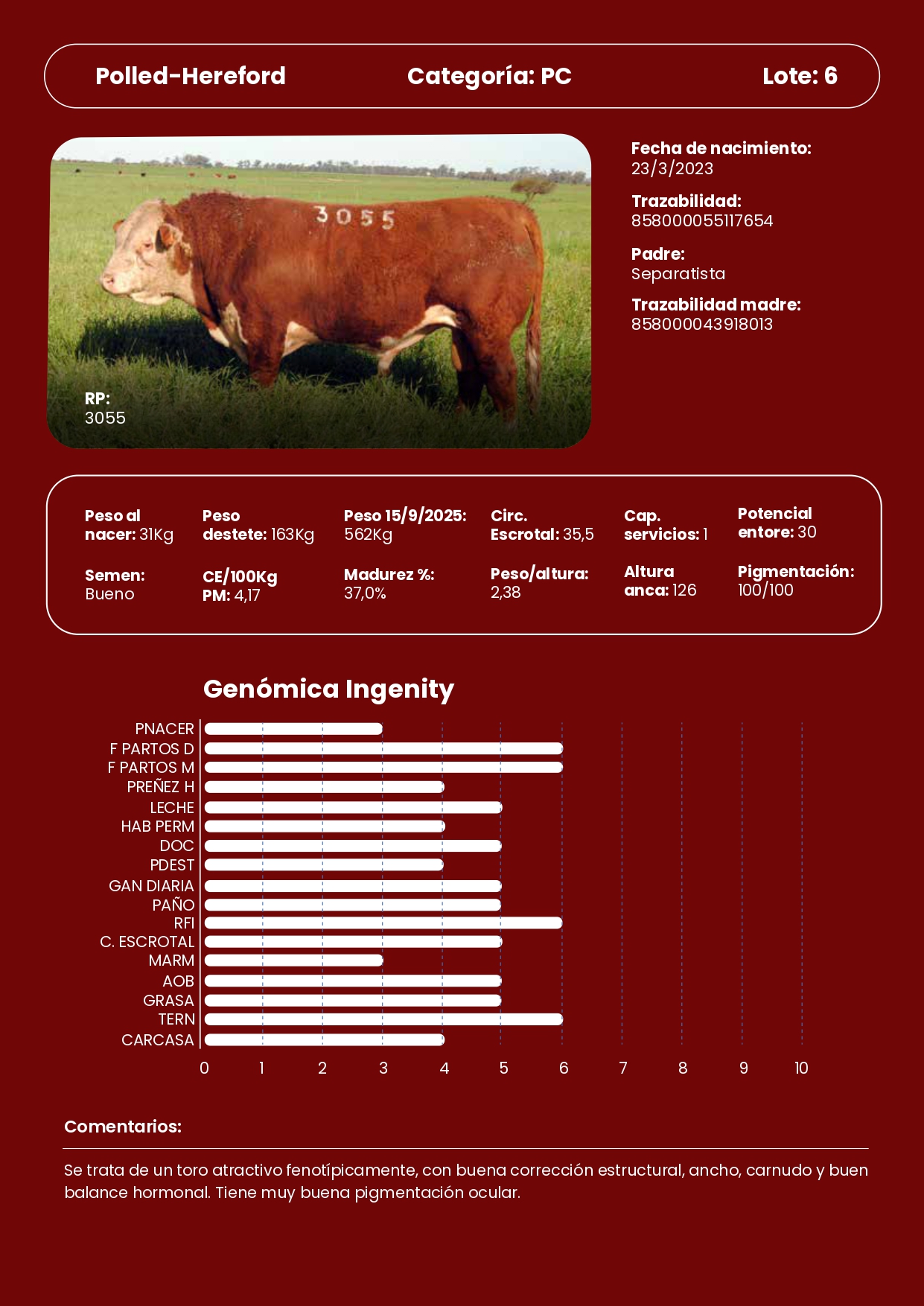 LOTE 6, 1 Toros PC 🔥 🔥 🔥 Lote Anterior Volver al remate Lote Siguiente Información del Lote Pedigree Ofertar Contacto Paysandú - Información del Lote Identificador: #338255 Categoría Toros PC Raza Polled-Hereford Certificado 3055 Departamento Paysandú Paysandú - Ofertar Fecha de cierre: 27 de Septiembre a las 19:00hs. Aún no tiene ofertas Plazo: Contado 30 días 45 días 60 días 90 días 120 días 180 días Contado, 30 y 60 dias Su Oferta en U$S: − + Step: -0,01 / +0,01 Programar puja hasta: Programar puja hasta Aumentar puja programada 3000.02 3000.2 ** Iniciar sesión para ofertar Ofertar Ofertas Recibidas U$S Fecha/Hora Estado Este lote aún no tiene preofertas. 115 Visualizaciones ClicData Pedigree Contacto Empresa: Genética Productiva Nombre*: E-mail* : Mensaje Enviar