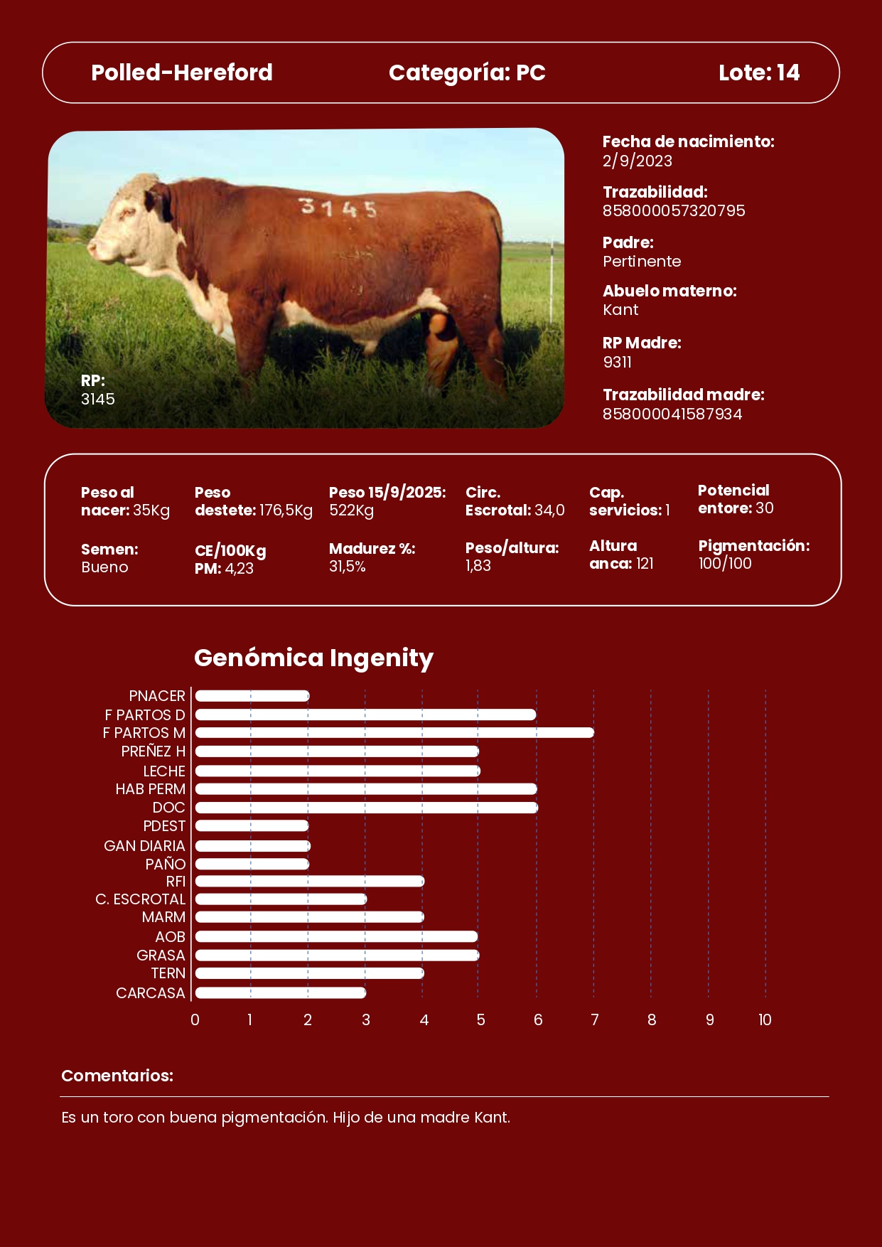 LOTE 14, 1 Toros PC Lote Anterior Volver al remate Lote Siguiente Información del Lote Pedigree Ofertar Contacto Paysandú - Información del Lote Identificador: #338263 Categoría Toros PC Raza Polled-Hereford Certificado 3145 Departamento Paysandú Paysandú - Ofertar Fecha de cierre: 27 de Septiembre a las 19:00hs. Aún no tiene ofertas Plazo: Contado 30 días 45 días 60 días 90 días 120 días 180 días Contado, 30 y 60 dias Su Oferta en U$S: − + Step: -0,01 / +0,01 Programar puja hasta: Programar puja hasta Aumentar puja programada 3000.02 3000.2 ** Iniciar sesión para ofertar Ofertar Ofertas Recibidas U$S Fecha/Hora Estado Este lote aún no tiene preofertas. 66 Visualizaciones ClicData Pedigree Contacto Empresa: Genética Productiva Nombre*: E-mail* : Mensaje Enviar