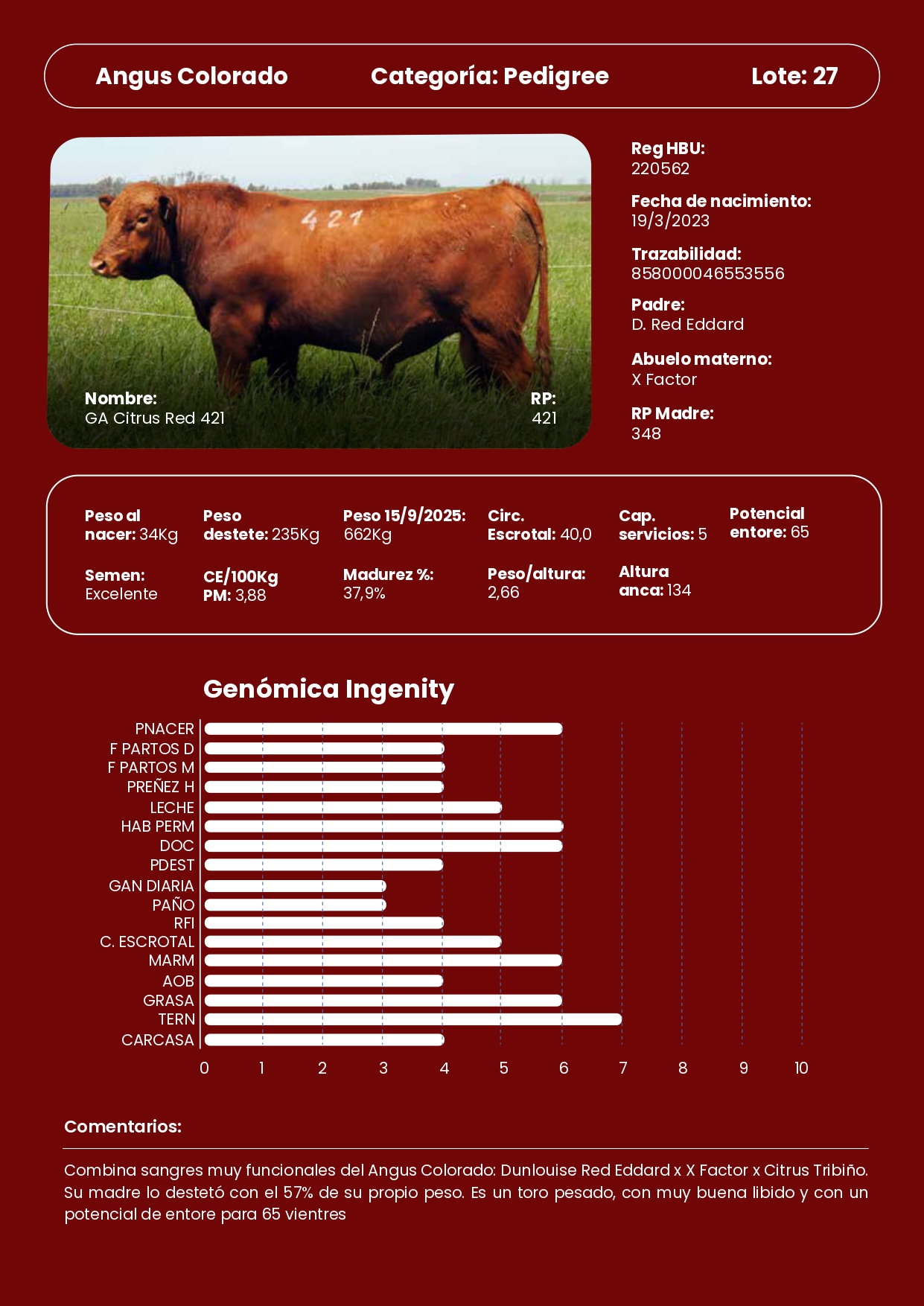 LOTE 27, 1 Toros PI 🔥 🔥 🔥 Lote Anterior Volver al remate Lote Siguiente Información del Lote Pedigree Ofertar Contacto Paysandú - Información del Lote Identificador: #338276 Categoría Toros PI Raza Angus Colorado Certificado 421 Departamento Paysandú Paysandú - Ofertar Fecha de cierre: 27 de Septiembre a las 19:00hs. Aún no tiene ofertas Plazo: Contado 30 días 45 días 60 días 90 días 120 días 180 días Contado, 30 y 60 dias Su Oferta en U$S: − + Step: -0,01 / +0,01 Programar puja hasta: Programar puja hasta Aumentar puja programada 3000.02 3000.2 ** Iniciar sesión para ofertar Ofertar Ofertas Recibidas U$S Fecha/Hora Estado Este lote aún no tiene preofertas. 242 Visualizaciones ClicData Pedigree Contacto Empresa: Genética Productiva Nombre*: E-mail* : Mensaje Enviar
