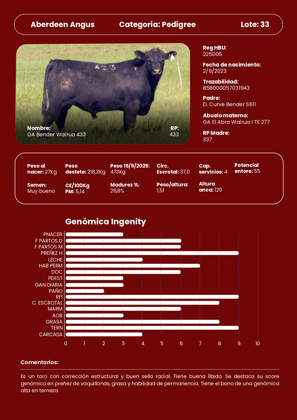 LOTE 33, 1 Toros PI Lote Anterior Volver al remate Lote Siguiente Información del Lote Pedigree Ofertar Contacto Paysandú - Información del Lote Identificador: #338282 Categoría Toros PI Raza Aberdeen Angus Certificado 433 Departamento Paysandú Paysandú - Ofertar Fecha de cierre: 27 de Septiembre a las 19:00hs. Aún no tiene ofertas Plazo: Contado 30 días 45 días 60 días 90 días 120 días 180 días Contado, 30 y 60 dias Su Oferta en U$S: − + Step: -0,01 / +0,01 Programar puja hasta: Programar puja hasta Aumentar puja programada 3000.02 3000.2 ** Iniciar sesión para ofertar Ofertar Ofertas Recibidas U$S Fecha/Hora Estado Este lote aún no tiene preofertas. 71 Visualizaciones ClicData Pedigree Contacto Empresa: Genética Productiva Nombre*: E-mail* : Mensaje Enviar
