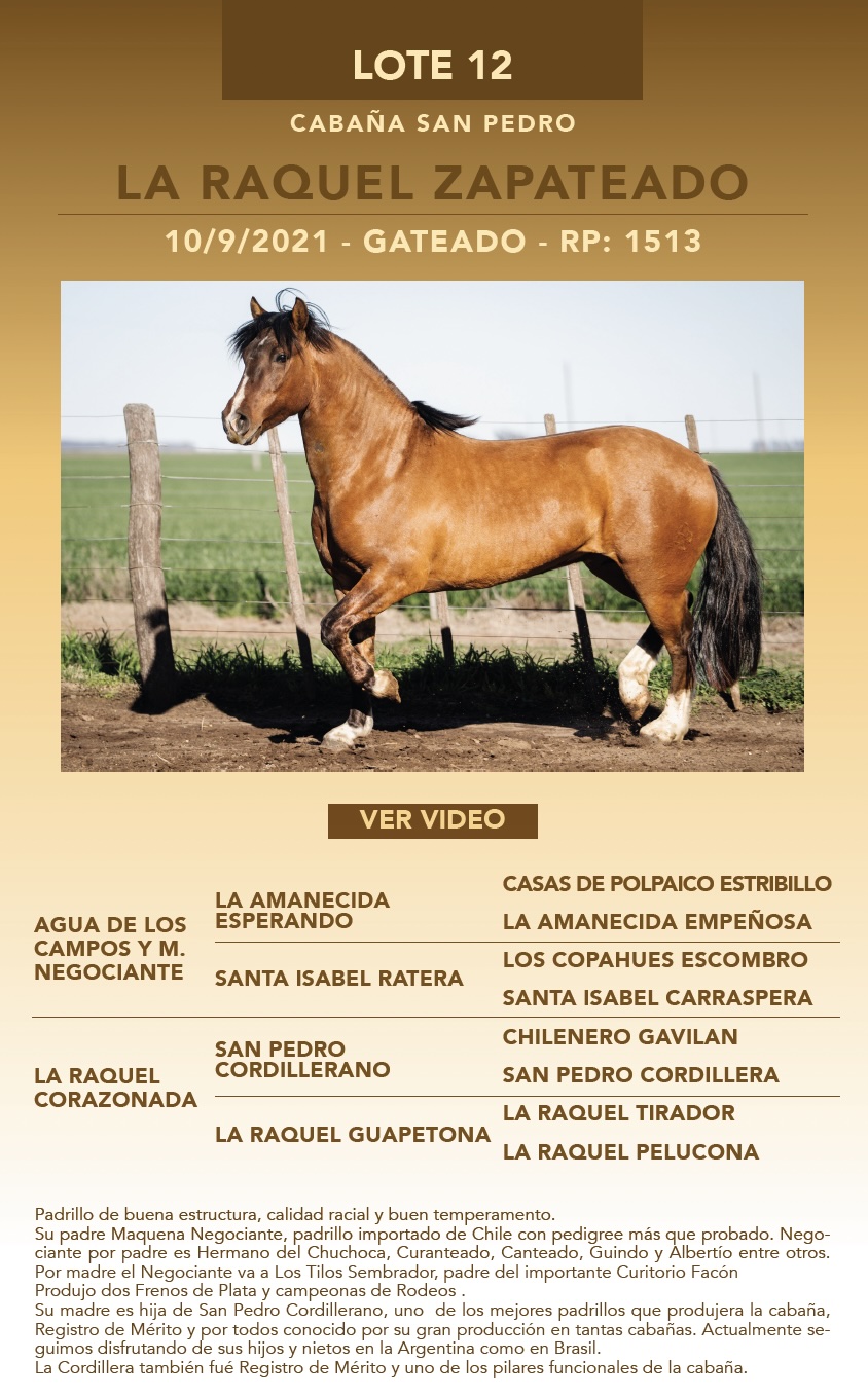 LOTE 12, LA RAQUEL ZAPATEADO 🔥 🔥 🔥 Lote Anterior Volver al remate Lote Siguiente Ficha Contacto Ofertar Buenos Aires - Ficha del Lote Identificador: #338800 Categoría: Potrancas Pedigree Buenos Aires - Ofertar Fecha de cierre: 22 de Septiembre a las 14:00hs. Aún no tiene ofertas Plazo: Contado 30 días 45 días 60 días 90 días 120 días 180 días Contado, 30 y 60 dias Su Oferta en $: − + Step: -10.000,00 / +10.000,00 Programar puja hasta: Programar puja hasta Aumentar puja programada 300000 480000 **Oferta al bulto Iniciar sesión para ofertar Ofertar Compra por $ 99.000.000,00 Ofertas Recibidas $ Fecha/Hora Estado Este lote aún no tiene preofertas. ¿Estás seguro de comprar el LOTE LA RAQUEL ZAPATEADO por $ 99000000 ? 439 Visualizaciones ClicData Contacto Empresa: El Rincón Criollos Nombre*: Teléfono* : E-mail* : Mensaje Enviar