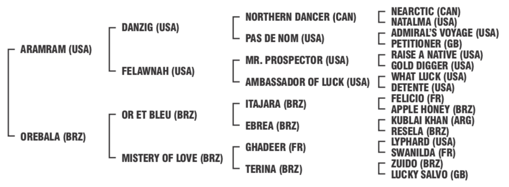 Por ARAMRAM, USA, 1999. (US$ 102.446) Ganador a los 3 años en Inglaterra, incl. Stanley Racing Thirsk Classic Trial -Thirsk; 3o Saint James Palace S (G1) -Royal Ascot- . Ganador a los 4 años en Emiratos Arabes Unidos. Por DANZIG (USA-1977 por Northern Dancer) Ganador de 3 cs. en USA y U$S 32.400 en premios “JEFE DE RAZA” es padre de más de 187 ganadores clásicos y 21 campeones, dentro de los cuales se destacan: DAYJUR “Caballo del Año” en Inglaterra, “Campeón 3 Años” en Inglaterra (G1), DANCE SMARTLY “Campeona 3 Años Hembra” “Caballo del Año” “Campeona 2 y 3 Años” en Canadá (G1), CHIEF ́S CROWN “Campeón 2 Años Macho” (G1); DANEHILL “Campeón 3 Años” en Inglaterra (G1), POLISH PRECEDENT “Campeón 3 Años” en Francia (G1); POLONIA Campeona 3 Años Hembra” en Francia e Irlanda (G.1), POLISH PATRIOT “Campeón 3 Años” en Inglaterra (G1), ARBUSHA “Campeona Yegua Adulta” en Irlanda; etc.