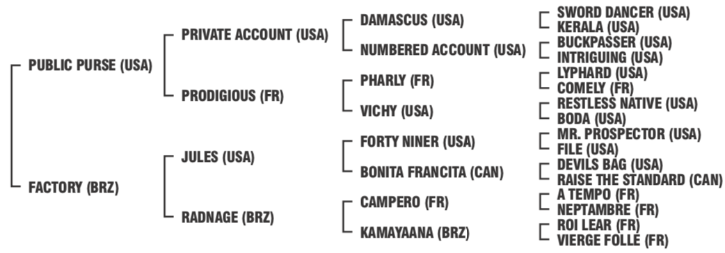 Por PUBLIC PURSE (1994). Ganador de US$ 1,103,324 en USA, Francia y N.A., San Marcos H. [G2], etc. Padre de 14 generaciones en edad de correr, 847 hijos, 720 corrieron, 43 ganadores clásicos, 3 campeones, 483 ganadores de 1486 carrereas y US$10,827,012 en premios, incluyendo AEROSOL (campeón en Brasil, US$ 366,282, Brasil [G1], etc.), CELTIC PRINCESS (BRZ) (Caballo del año en Brasil, US$330,624, Grande Premio Margarida Polak Lara-Taca de Prata [G1], etc.), RUBIA DE NEW YORK (Campeona en Uruguay, $103,660 USA, Gran Premio Criterium, etc.), IMPONENTE PURSE (BRZ) (US$ 266,207, Sunset H. [G3] (HOL, $60,000), etc.), CASH DO JAGUARETE (BRZ) ($235,685 USA, J. Adhemar de Almeida Prado - Taca de Prata [G1], etc.), HAWK'S EYES (BRZ) ($221,713 USA, Grande Premio Ipiranga-Brazilian Two Thousand Guineas [G1], etc.)