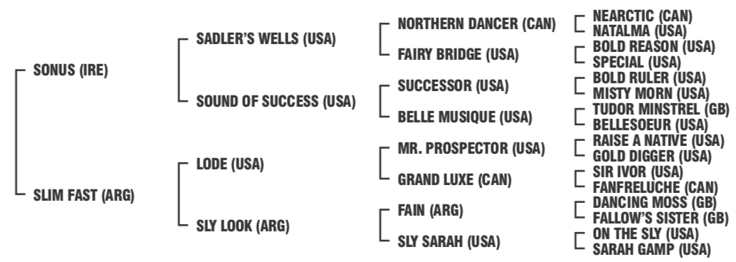 Por SONUS (IRE) (1989). Ganador clásico de US$ 327,295 en Inglaterra, Tiffany Goodwood Cup [G3], Leicester Mercury S., etc. Padre de 12 generaciones en edad de correr, 332 hijos, 171 corrieron, 6 ganadores clásicos, 93 ganadores de 245 carreras y ganancias por US$ 1,524,747 USA, incluyendo Tuozzo (US$ 142,902, GP De Honor [G1], etc.), Safari Girl, Polla de Potrancas [G1]), Kissing You, Jockey Club de la Provincia de Buenos Aires [G2], etc.), Hot Commodity, Grande Premio Zelia Gonzaga Peixoto de Castro [G1]), High Book (Luis Monteverde, etc.), Federal Reserve (Jubilee H. [G2], etc.). Abuelo materno de ganadores clasicos como SAFARI QUEEN (ARG) (campeona), Escape Of Glory, Descocado, Es Despues, Peten Itza, Eternal Fire, Safari Miss.