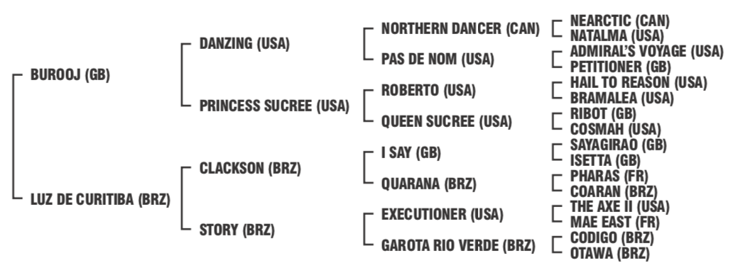 LUZ DE CURITIBA (BRZ), por Clackson (BRZ). Sin figuraciones en 1 actuación en BRZ. Media hermana de KENTUCKY'S STORY (BRZ), Oswaldo Aranha [G1], etc.), GLORY STORY, Grande Premio Presidente Antonio Correa Barbosa [G2]), DAY OF GLORY, GP Presidente Roberto Alves de Almeida [G3], etc.). Madre de 4 ganadores-