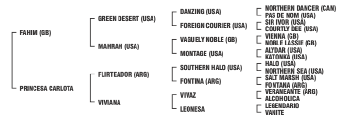 Por FAHIM (GB), 1993. Ganador de 5 carreras (3 GB, 1 UAE,1 USA) US$ 301,180; incl. Laurel Fort Mc Henry H (L), 2000m- record, Goodwood Volvo Truck Finance Globetrotter H,1.800m, Newmarket Hare Park H, 1.600m; Beverley Eton Maiden St. 1.700m; 2o Saratoga Sword Dancer Invitational St (G1), 2400 m;; etc. Padre de: RELENTO (“Maroñas del Año 2008” “Caballo del Año 2008” “Mejor Caballo Adulto del 2008” Mejor Fondista del 2008” Excepcional animal de pistas. Ganador de 14 carreras en Maroñas, incl. 11 Clásicos en forma consecutiva (récord histórico)). PERICHOLE (GP Z. Gonzaga Peixoto -G1); REIZINHO (GP Pres. Antonio C. Barbosa G2 Record: 2'13''996 - 2.200m - arena, GP Piratininga G2, 2o GP Internacional Latino Americano G1 (Chile), Padrillo); BLESSED MUSTANG (GP Oswaldo Aranha G3); QUICKEN GIRL (GP Mário de A. Ribeiro G3); AGASIAS (G2-X2); etc.